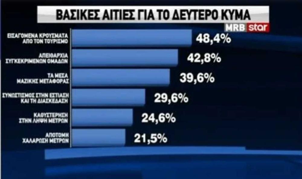 Στην ερώτηση για το ποιος ευθύνεται για το δεύτερο κύμα του κορωνοϊού το 48,4% απαντά πως φταίει ο τουρισμός, το 42,8% η απειθαρχία συγκεκριμένων ομάδων, το 39,6% ο συνωστισμός στα μέσα μεταφοράς, το 29,6% ο συνωστισμός στην εστίαση, το 24,6% η καθυστέρηση στη λήψη μέτρων.