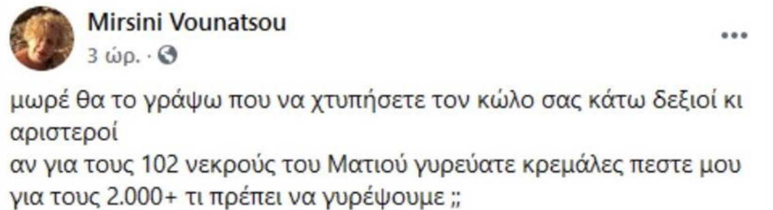«Μωρέ θα το γράψω που να χτυπήσετε τον κ@@ο σας κάτω δεξιοί και αριστεροί. Αν για τους 102 νεκρούς του Ματιού γυρεύατε κρεμάλες πέστε μου για τους 2.000+ τι πρέπει να γυρέψουμε;;», έγραψε χαρακτηριστικά.