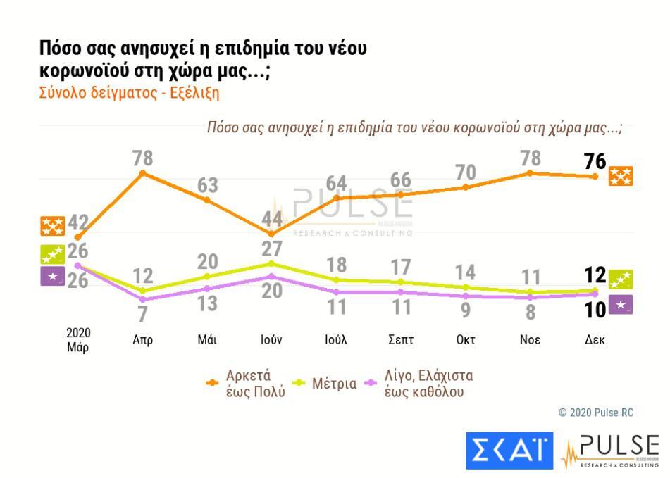 Ειδικότερα, στην ερώτηση πόσο σας ανησυχεί η επιδημία του νέου κορωνοϊού στη χώρα μας το 76% των ερωτηθέντων συνολικά απαντά πολύ (51%) και αρκετά (25%) έναντι 78% στη δημοσκόπηση Νοεμβρίου. 12% των ερωτώμενων απαντά μέτρια, ενώ 10% συνολικά απαντά λίγο ή ελάχιστα έως καθόλου (από 5%).