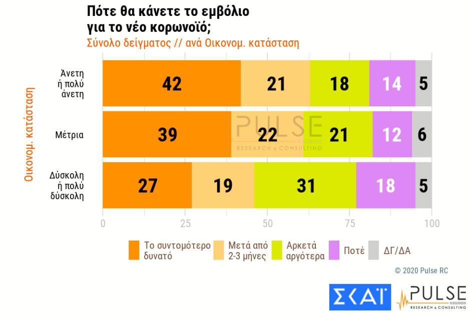 Το 42% όσων πολιτών δηλώνουν ότι έχουν άνετη ή πολύ οικονομική κατάσταση αναφέρουν ότι θα εμβολιαστούν το συντομότερο δυνατό, το 21% ότι θα εμβολιαστεί μετά από 2 με 3 μήνες, το 18% λέει αρκετά αργότερα, ενώ το 14% ποτέ.