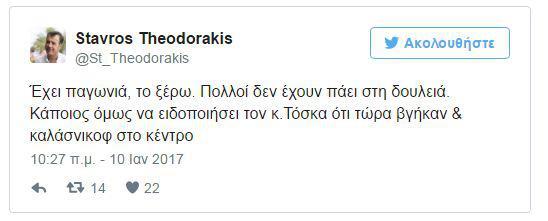 «Έχει παγωνιά, το ξέρω. Πολλοί δεν έχουν πάει στη δουλειά. Κάποιος όμως να ειδοποιήσει τον κ.Τόσκα ότι τώρα βγήκαν & καλάσνικοφ στο κέντρο», ήταν το σχόλιό του.