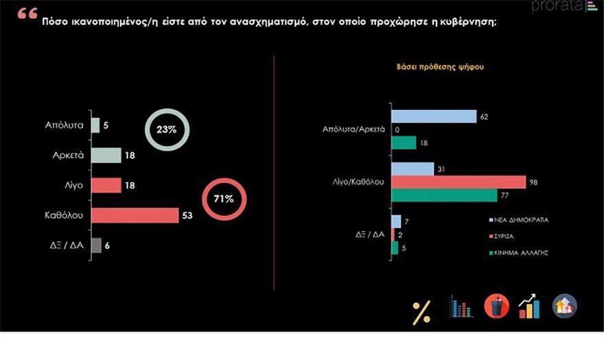 Η πλειοψηφία (71%) δηλώνει λίγο ή και καθόλου ικανοποιημένη από τον ανασχηματισμό στον οποίο προχώρησε η ελληνική κυβέρνηση και μόλις το 24% αρκετά ή απόλυτα ικανοποιημένο. Η αντίληψη που κυριαρχεί ως προς τις στοχεύσεις του ανασχηματισμού ήταν ότι η κυβέρνηση επιχείρησε «να δημιουργήσει ένα κυβερνητικό σχήμα εκλογικής ετοιμότητας» και «να εξυπηρετήσει φίλους και ημετέρους».