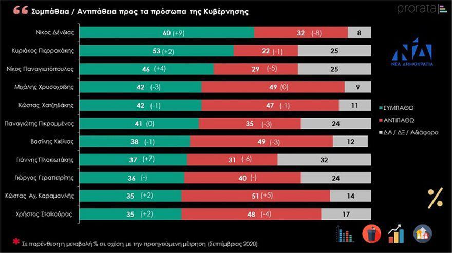 Μεταξύ των προσώπων της κυβέρνησης, ως τα δημοφιλέστερα στο εκλογικό σώμα ανεξαρτήτως εκλογικής προτίμησης καταγράφονται ο Νίκος Δένδιας με 60% (με θεαματική άνοδο σε σχέση με την προηγούμενη μέτρηση), ο Κυριάκος Πιερρακάκης με 53% ο Νίκος Παναγιωτόπουλος με 46%, ο Κωστής Χατζηδάκης με 42% και ο Μιχάλης Χρυσοχοΐδης με 42%.