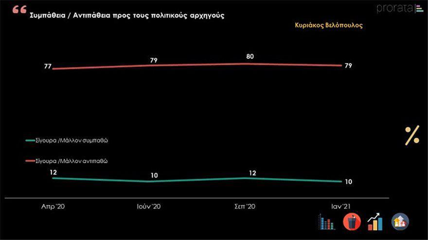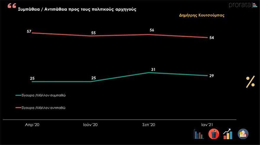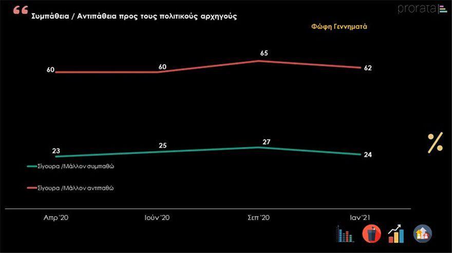 O πρωθυπουργός καταγράφεται με σημαντική διαφορά ως ο δημοφιλέστερος πολιτικός αρχηγός, παρά την ελαφρά μείωση της δημοφιλίας του, με το 46% να δηλώνει πως «σίγουρα ή μάλλον τον συμπαθεί».