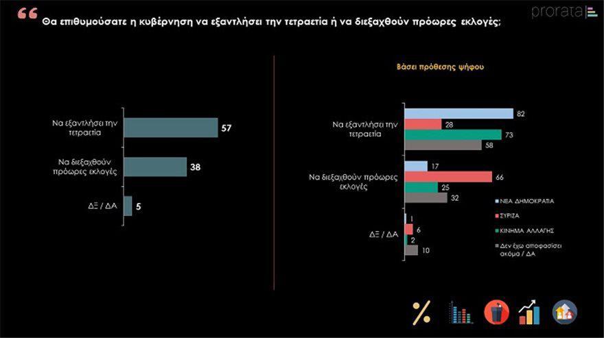 Το 57% επιθυμεί να εξαντλήσει την τετραετία η ελληνική κυβέρνηση, ενώ το 38% επιθυμεί να διεξαχθούν πρόωρες εκλογές.