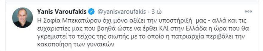 «Η Σοφία Μπεκατώρου όχι μόνο αξίζει την υποστήριξή μας -αλλά και τις ευχαριστίες μας που βοηθά ώστε να έρθει ΚΑΙ στην Ελλάδα η ώρα που θα γκρεμιστεί το τείχος της σιωπής, με το οποίο η πατριαρχία περιβάλει την κακοποίηση των γυναικών», αναφέρει ο Γιάνης Βαρουφάκης.