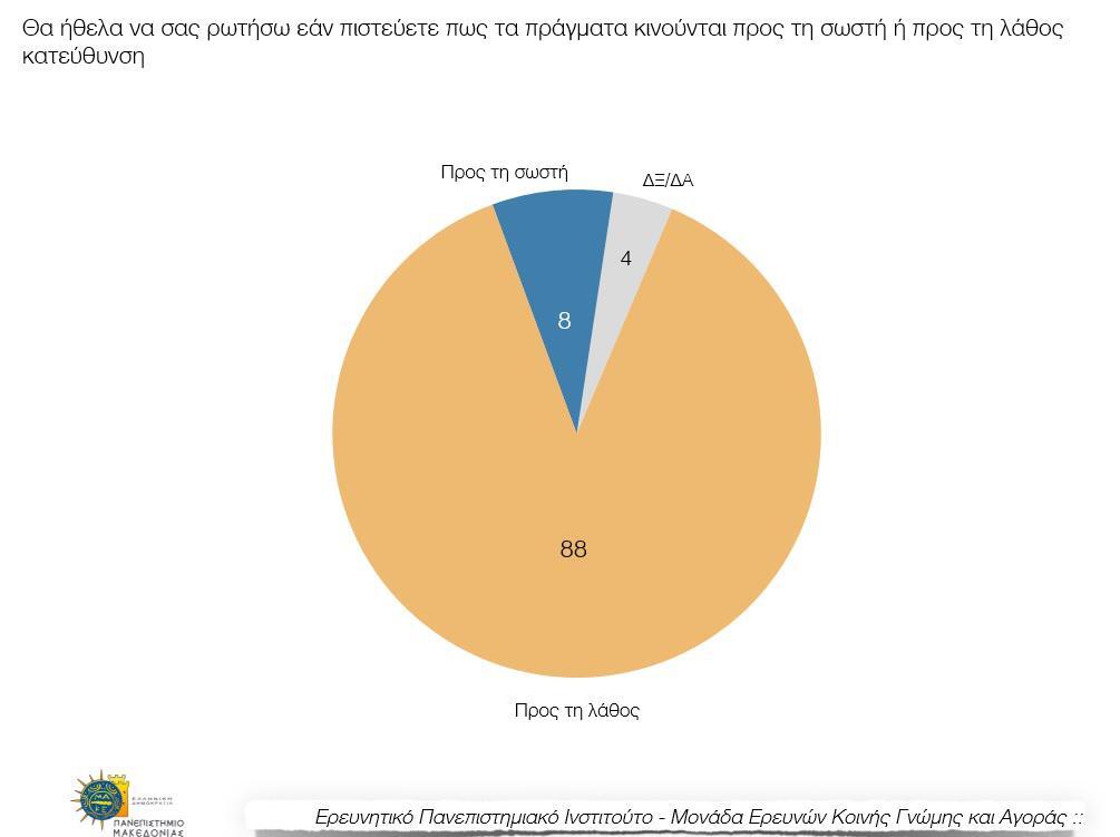 Η έρευνα έγινε κατά το διάστημα 15- 17 Ιανουαρίου. Σε ποσοστό 88% οι ερωτηθέντες απαντούν ότι τα πράγματα κινούνται προς τη λάθος κατεύθυνση. Με την ίδια απαισιοδοξία, το 72% των ερωτηθέντων εκτιμά ότι το 2017 θα είναι χειρότερο από το 2016. Ο «δείκτης απαισιοδοξίας» μεγάλωσε κατά 8 ποσοστιαίες μονάδες σε σχέση με την αντίστοιχη έρευνα του Δεκεμβρίου. Η ίδια απαισιοδοξία διακατέχει του Ελληνες και στο ερώτημα αν περιμένουν βελτίωση των οικονομικών τους.