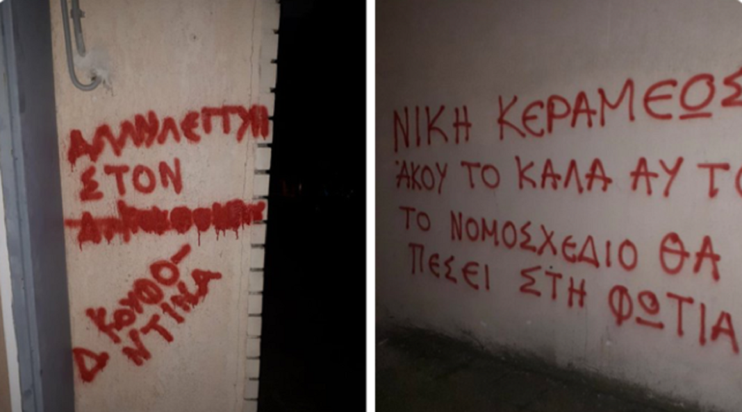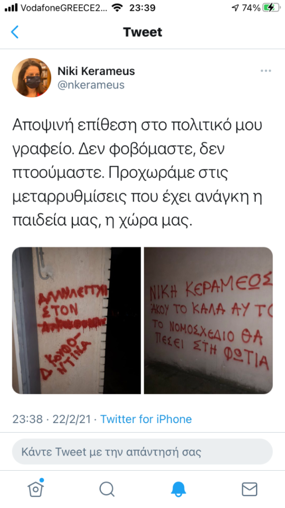 Ανακοίνωση του Υφυπουργού παρά τω Πρωθυπουργώ και Κυβερνητικού Εκπροσώπου Χρήστου Ταραντίλη για τη νέα επίθεση στο γραφείο της Υπουργού Παιδείας και Θρησκευμάτων, Νίκης Κεραμέως: “Τραμπούκοι έγραψαν συνθήματα στο γραφείο της Υπουργού Παιδείας Νίκης Κεραμέως υπέρ του καταδικασμένου για 11 δολοφονίες Δημήτρη Κουφοντίνα κι εναντίον του νόμου για την φύλαξη των ΑΕΙ από έκνομες δραστηριότητες.