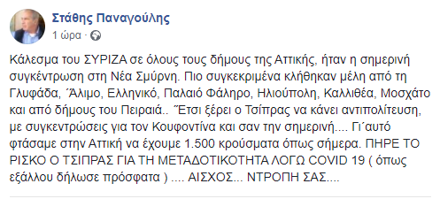 Κάλεσμα του ΣΥΡΙΖΑ σε όλους τους δήμους της Αττικής, ήταν η σημερινή συγκέντρωση στη Νέα Σμύρνη. Πιο συγκεκριμένα, κλήθηκαν μέλη από Γλυφάδα, Αλιμο, Ελληνικό, Παλαιό Φάληρο, Ηλιούπολη, Καλλιθέα, Μοσχάτο και από δήμους του Πειραιά… Ετσι ξέρει ο Τσίπρας να κάνει αντιπολίτευση, με συγκεντρώσεις για τον Κουφοντίνα και σαν την σημερινή… Γι’ αυτό φτάσαμε στην Αττική να έχουμε 1.500 κρούσματα, όπως σήμερα. ΠΗΡΕ ΤΟ ΡΙΣΚΟ Ο ΤΣΙΠΡΑΣ ΓIA TH METAΔΟΤΙΚΟΤΗΤΑ ΛΟΓΩ COVID-19 (όπως εξάλλου δήλωσε πρόσφατα) … ΑΙΣΧΟΣ… ΝΤΡΟΠΗ ΣΑΣ…