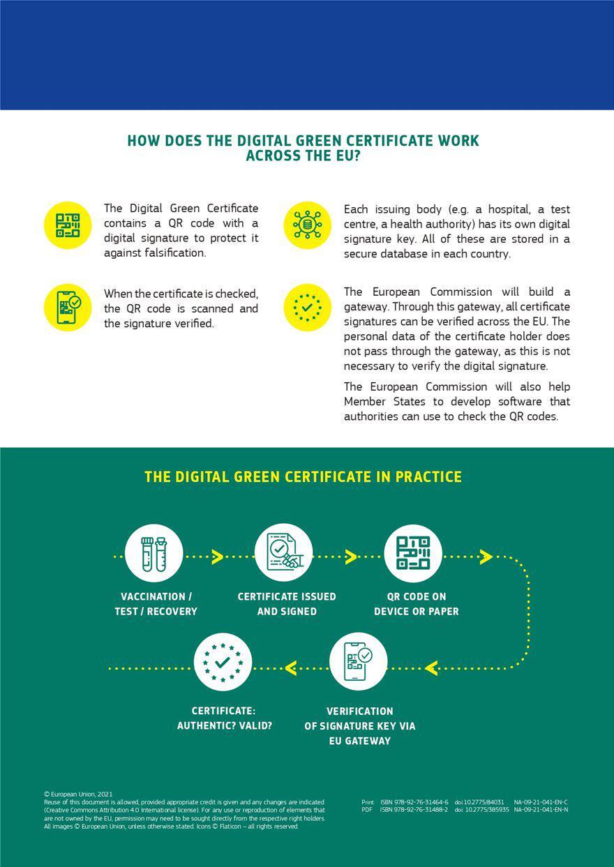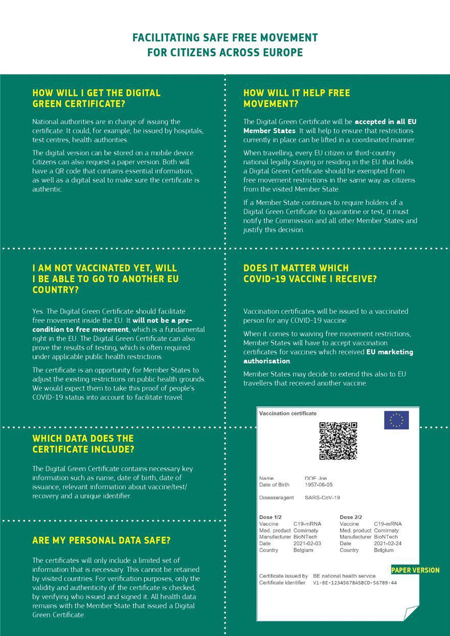 Το ψηφιακό πράσινο πιστοποιητικό θα αποδεικνύει ότι ένα άτομο έχει εμβολιαστεί κατά του κορονοϊού, έχει υποβληθεί σε εξέταση με αρνητικό αποτέλεσμα ή έχει αναρρώσει από την ασθένεια. Θα διατίθεται δωρεάν σε ψηφιακή ή έντυπη μορφή. Θα περιλαμβάνει κωδικό QR με σκοπό την εγγύηση της ασφάλειας και της γνησιότητάς του.