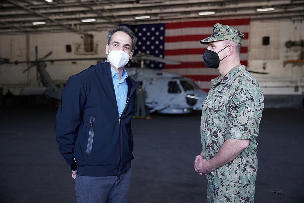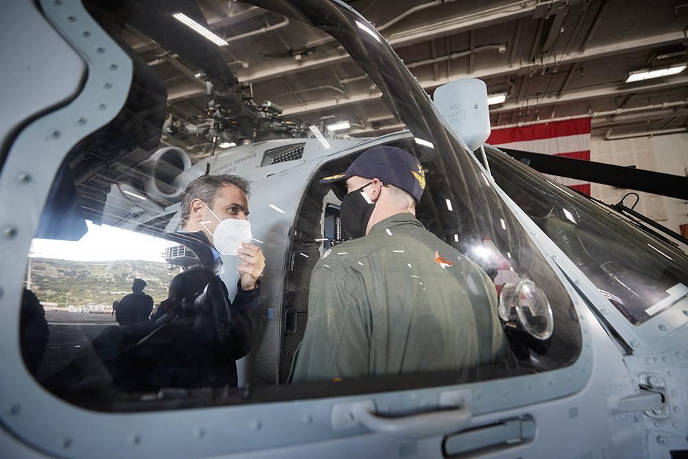 Ο Κυριάκος Μητσοτάκης αρχικά επισκέφθηκε υπόστεγο όπου φυλάσσεται ελικόπτερο MH-60R «Romeo», ένα από τα πλέον σύγχρονα ελικόπτερα του αμερικανικού Ναυτικού. Η Ελλάδα έχει υπογράψει σύμβαση για την απόκτηση τεσσάρων τέτοιων ελικοπτέρων σε πρώτη φάση, συν ακόμα τρία στη συνέχεια. Τα πρώτα θα παραληφθούν στα μέσα του 2022. Ο Πρωθυπουργός ενημερώθηκε από το πλήρωμα για τις ποικίλες επιχειρησιακές δυνατότητες του αεροσκάφους και για τον χειρισμό του.
