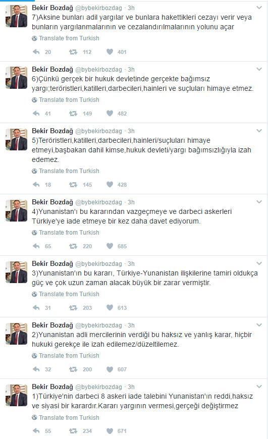 Με σειρά αναρτήσεών του στον προσωπικό του λογαριασμό στο Twitter, ο Μποζντάγ υπογράμμισε ότι «η απόρριψη του αιτήματος της Τουρκίας για έκδοση των οκτώ πραξικοπηματιών, από την Ελλάδα, είναι μια άδικη και πολιτική απόφαση. Το ότι η απόφαση ελήφθη από την Δικαιοσύνη δεν αλλάζει την πραγματικότητα.