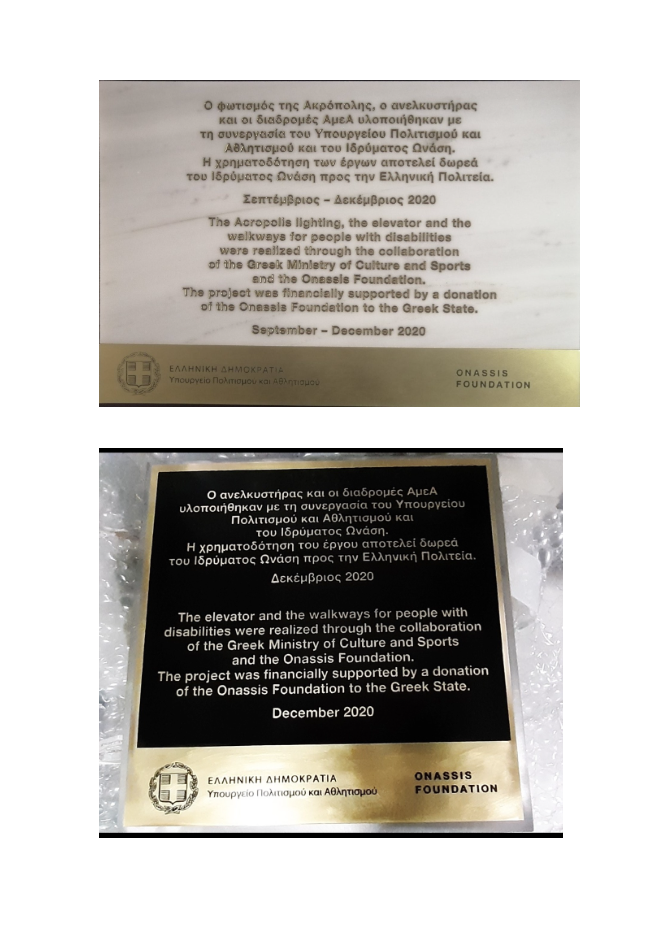 Υπενθυμίζεται πως το άρθρο 9 της σχετικής σύμβασης ανέφερε χαρακτηριστικά: «Το Δημόσιο συμφωνεί ότι στην αρχή και την απόληξη της πλατφόρμας του Ανελκυστήρα Πλαγιάς και στην είσοδο των Προπυλαίων της Ακρόπολης δίπλα από την σχετική επιγραφή που αφορά την χορηγία της Ε.Ε και του Ινστιτούτου Θερβάντες, θα μπει ειδική μαρμάρινη επιγραφή διαστάσεων ίσων προς τις δύο προαναφερόμενες (άλλως τουλάχιστον 70χ40 εκ.) που θα αναφέρει: “Ο Ανελκυστήρας Πλαγιάς και ο Φωτισμός της Ακροπόλεως πραγματοποιήθηκαν με αποκλειστική χορηγία του Ιδρύματος Ωνάση επί Υπουργού Πολιτισμού Λίνας Μενδώνη (Ιούνιος 2020). Η ακριβής θέση και οι ειδικές προδιαγραφές της εν λόγω αναφοράς θα οριστικοποιούνται με υπόδειξη του Δωρεοδόχου μετά από προηγούμενη συναίνεση του Ιδρύματος».