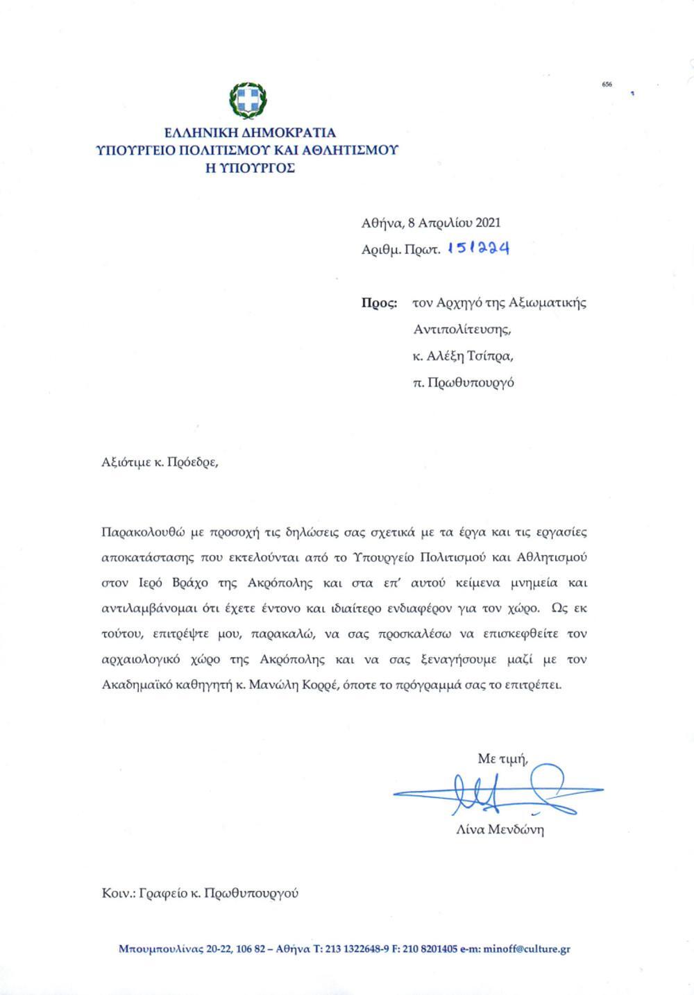 «Παρακολουθώ με προσοχή τις δηλώσεις σας σχετικά με τα έργα και τις εργασίες αποκατάστασης που εκτελούνται από το Υπουργείο Πολιτισμού και Αθλητισμού στον Ιερό Βράχο της Ακρόπολης και στα επ’ αυτού κείμενα μνημεία και αντιλαμβάνομαι ότι έχετε έντονο και ιδιαίτερο ενδιαφέρον για τον χώρο. Ως εκ τούτου, επιτρέψτε μου, παρακαλώ, να σας προσκαλέσω να επισκεφθείτε τον αρχαιολογικό χώρο της Ακρόπολης και να σας ξεναγήσουμε μαζί με τον Ακαδημαϊκό καθηγητή κ. Μανώλη Κορρέ, όποτε το πρόγραμμά σας το επιτρέπει».