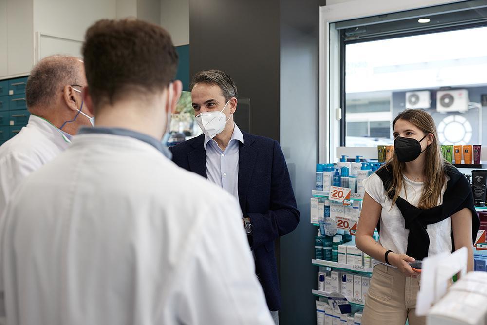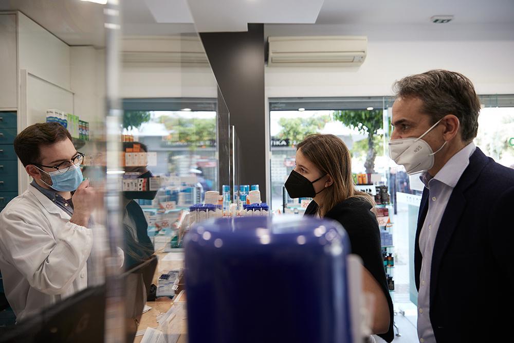 Ο Κυριάκος Μητσοτάκης εξήγησε ότι η Δάφνη βρίσκεται στην Γ’ Λυκείου, έτσι προσήλθαν στο φαρμακείο για την προμήθεια του self-test. «Ήρθαμε να πάρουμε το τεστ μας. Πώς πάνε μέχρι στιγμής οι παραδόσεις;», ρώτησε ο πρωθυπουργός τον φαρμακοποιό για να του απαντήσει πως «οι παραδόσεις επί του παρόντος σε εμάς είναι ομαλές. Η πλατφόρμα δουλεύει μία χαρά, είμαστε πάντα στο πλευρό του καθενός όποτε θέλει για διευκρινίσεις. Του τα εξηγούμε λεπτομερώς, για να έχει μία πρώτη άποψη. Από εκεί και πέρα του δίνουμε και τις οδηγίες και πάντα εδώ είμαστε, τα τηλέφωνά μας τα ξέρουν».