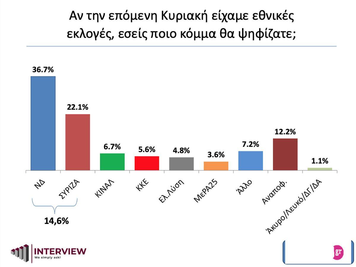 Ισχυρό προβάδισμα 14,6% για τη ΝΔ στην πρόθεση ψήφου καταγράφει πανελλαδική δημοσκόπηση της Interview που πραγματοποιήθηκε για λογαριασμό του Politic.gr. Σε αυτήν η ΝΔ συγκεντρώνει το 36,7% της προτίμησης των ερωτηθέντων, ο ΣΥΡΙΖΑ το 22,1%, ενώ το ΚΙΝΑΛ το 6,7% και εδραιώνεται στην τρίτη θέση.
