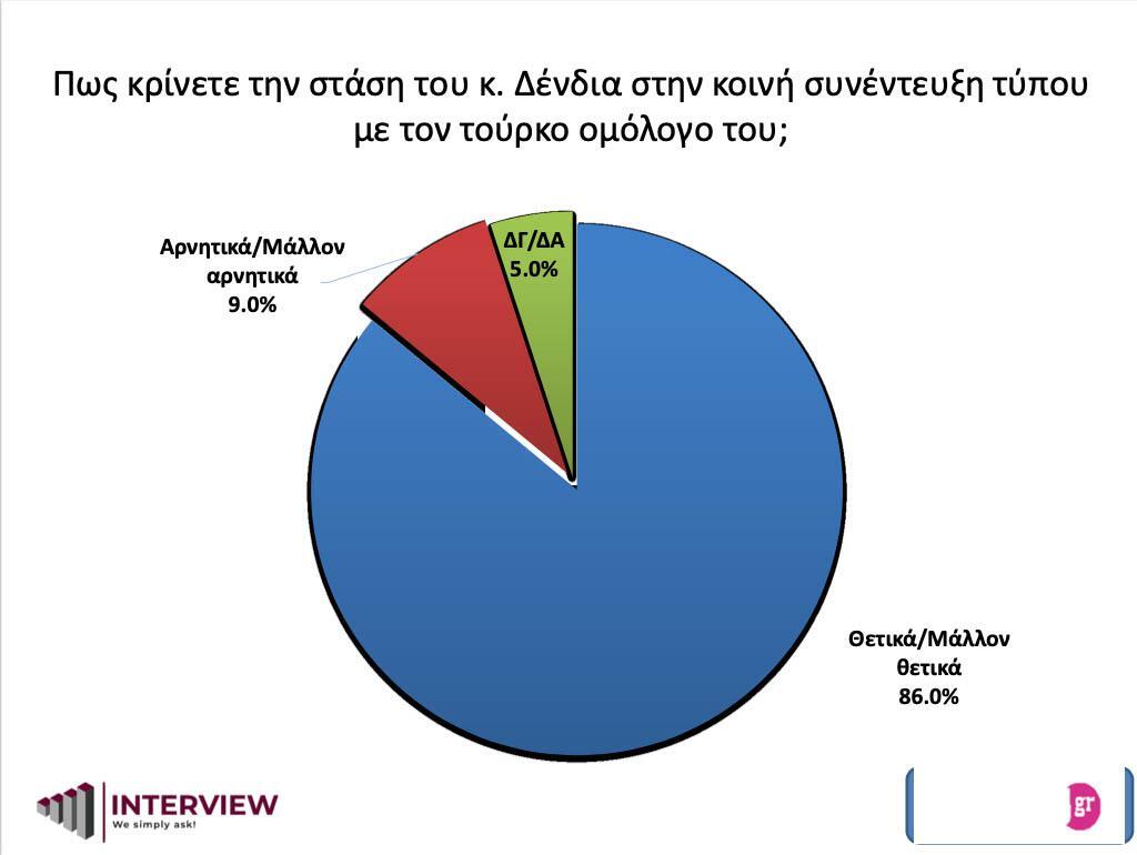 Όσον αφορά το μπρα ντε φερ Νίκου Δένδια και Μεβλούτ Τσαβούσογλου στην Άγκυρα, στη δημοσκόπηση αποτυπώνεται συντριπτική αποδοχή της στάσης του Έλληνα Υπουργού Εξωτερικών, καθώς το 86% επιδοκιμάζει τις απαντήσεις που έδωσε στις προκλήσεις του Τούρκου ομολόγου του.