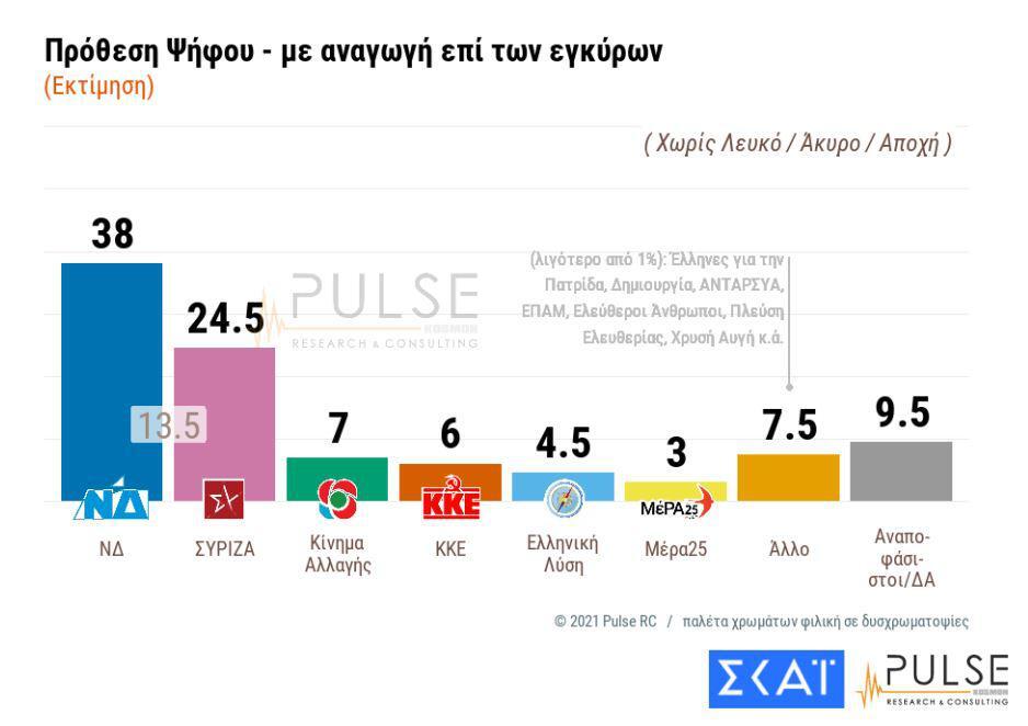 Πιο αναλυτικά η ΝΔ συγκεντρώνει 38%, ο ΣΥΡΙΖΑ 24,5% και ακολουθούν το Κίνημα Αλλαγής με 7%, το ΚΚΕ με 6%, η Ελληνική Λύση με 4,5%, το ΜέΡΑ25 με 3%. «Άλλο» κόμμα δηλώνει ότι θα ψηφίσει το 7,5%, ενώ οι αναποφάσιστοι φτάνουν το 9,5%.