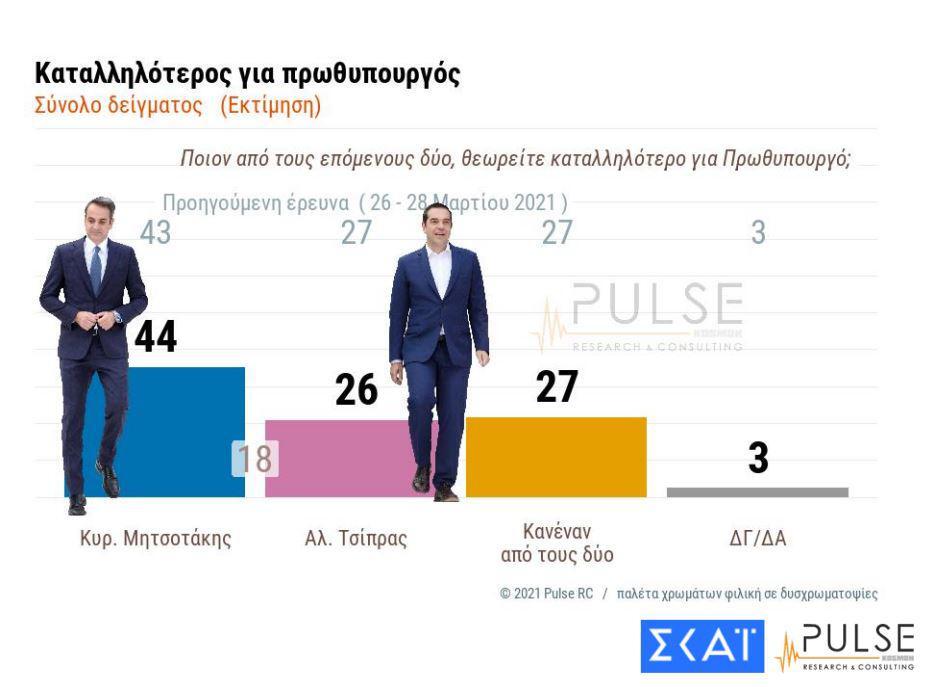 Στην καταλληλότητα για την πρωθυπουργία, προηγείται ο Κυριάκος Μητσοτάκης με 18 μονάδες διαφορά από τον Αλέξη Τσίπρα. Πιο συγκεκριμένα, το 44% θεωρεί καταλληλότερο για πρωθυπουργό τον Κυριάκο Μητσοτάκη, το 26% τον Αλέξη Τσίπρα. «Κανέναν από τους δύο» απάντησαν το 27%.