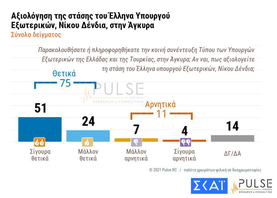 Η πλειοψηφία των πολιτών σε ποσοστό 75% αξιολόγησε θετικά τη στάση του Έλληνα υπουργού Εξωτερικών στην Άγκυρα (51% σίγουρα θετικά, 24% μάλλον θετικά) και μόλις το 11% την κρίνει αρνητικά (7% μάλλον αρνητικά, 4% σίγουρα αρνητικά). Στο 14% ανήλθαν οι απαντήσεις «δεν γνωρίζω/δεν απαντώ».