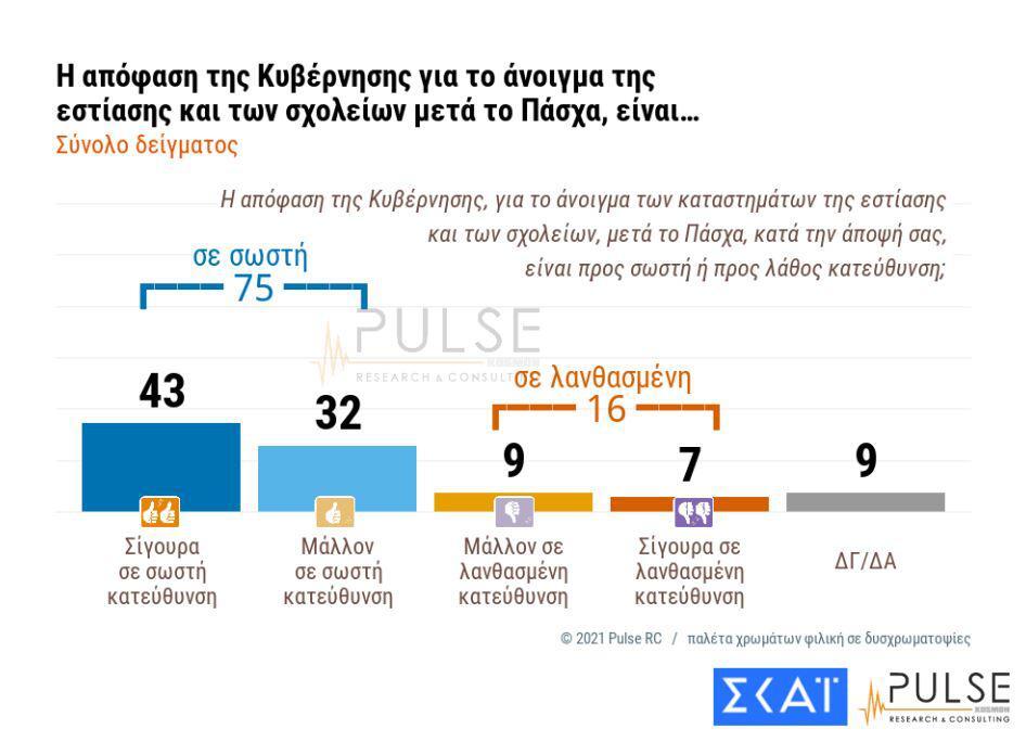 Ακόμα μεγαλύτερη είναι η αποδοχή της απόφασης για άνοιγμα των καταστημάτων της εστίασης και των σχολείων μετά το Πάσχα καθώς το 75% εκτιμά ότι κινείται σε θετική κατεύθυνση και μόλις το 16% τοποθετείται αρνητικά. Ειδικότερα, το 34% απαντά ότι η απόφαση κινείται σίγουρα σε θετική κατεύθυνση, το 32% μάλλον σε θετική κατεύθυνση, το 9% μάλλον σε λανθασμένη κατεύθυνση, το 7% σίγουρα σε λανθασμένη κατεύθυνση, ενώ το 9% απαντά «δεν γνωρίζω/δεν απαντώ».