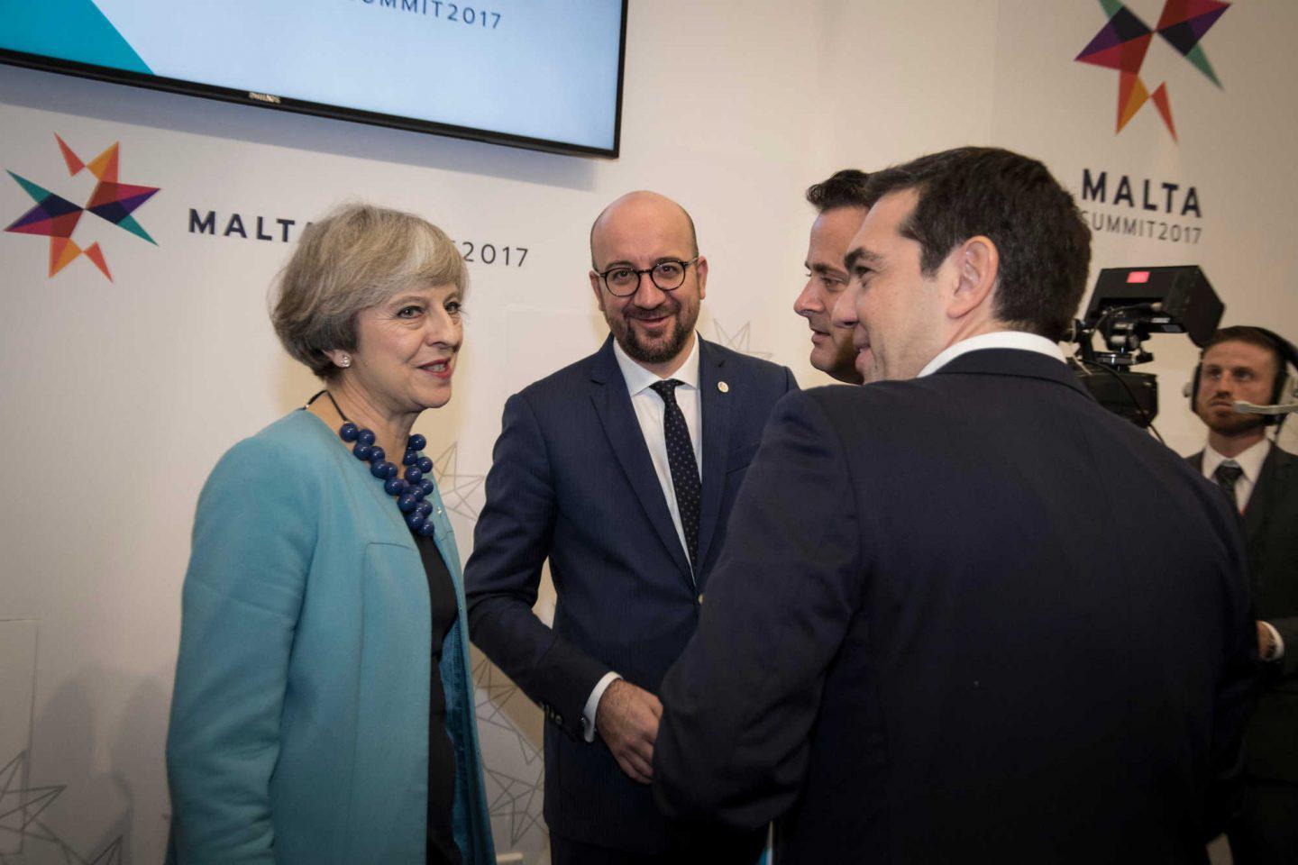 Σύμφωνα με πληροφορίες, ο πρωθυπουργός συζήτησε με την κ. Μέι την πορεία των συνομιλιών για το Κυπριακό.