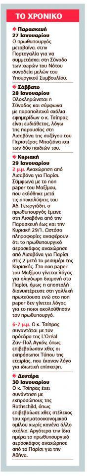 Ως γνωστόν, το Μαξίμου παραδέχθηκε ότι είχε ολιγόωρη στάση στο Παρίσι για συνομιλίες με την Ρότσιλντ και την L’Οréal. Μάλιστα, στο non paper το περασμένο Σάββατο έγραφε ότι η επενδυτική τράπεζα είναι επίσημος σύμβουλος της ελληνικής κυβέρνησης αναφέροντας χαρακτηριστικά ότι ο Αλ. Τσίπρας «εκεί είχε συναντήσεις με τον πρόεδρο της L’Οréal, η οποία προετοιμάζει μεγάλη επένδυση στη χώρα μας, με εκπροσώπους της επενδυτικής τράπεζας Rothschild, που αποτελεί επίσημο σύμβουλο του ΟΔΔΗΧ με αντικείμενο την προετοιμασία της εξόδου της χώρας στις αγορές, αλλά και με άλλους επενδυτικούς παράγοντες».