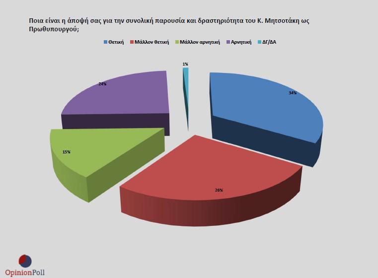 – Όπως προκύπτει από την έρευνα, ο Πρωθυπουργός Κ. Μητσοτάκης έχει με μεγάλη διαφορά την υψηλότερη δημοφιλία από όλους τους άλλους Πολιτικούς Αρχηγούς με το 58.8% να έχει θετική άποψη με το 40.3% να έχει αρνητική. Ταυτόχρονα είναι ο μόνος Πολιτικός Αρχηγός που παρουσιάζει θετικό ισοζύγιο θετικών – αρνητικών απόψεων και μάλιστα της τάξης του 18.5%.