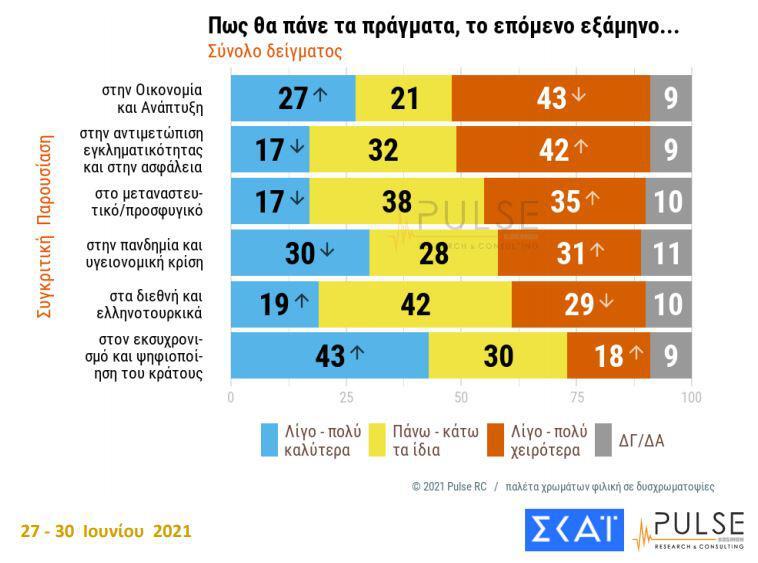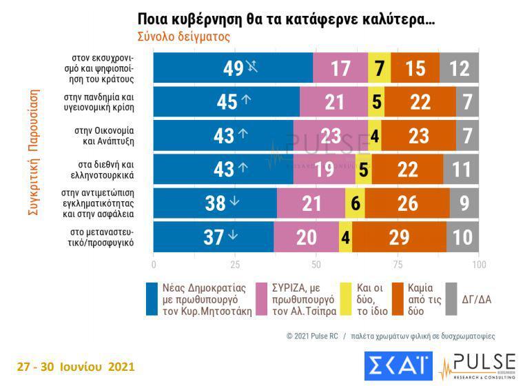 Στην ερώτηση ποια κυβέρνηση θα τα κατάφερνε καλύτερα σε όλους τους παραπάνω τομείς, η πλειοψηφία των ερωτηθέντων απάντησε με τη Νέα Δημοκρατία και πρωθυπουργό τον Κυριάκο Μητσοτάκη.