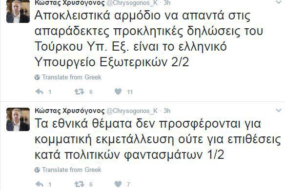 «Αποκλειστικά αρμόδιο να απαντά στις απαράδεκτες προκλητικές δηλώσεις του Τούρκου Υπ. Εξ. είναι το ελληνικό Υπουργείο Εξωτερικών» σημειώνει σε άλλη του ανάρτηση.