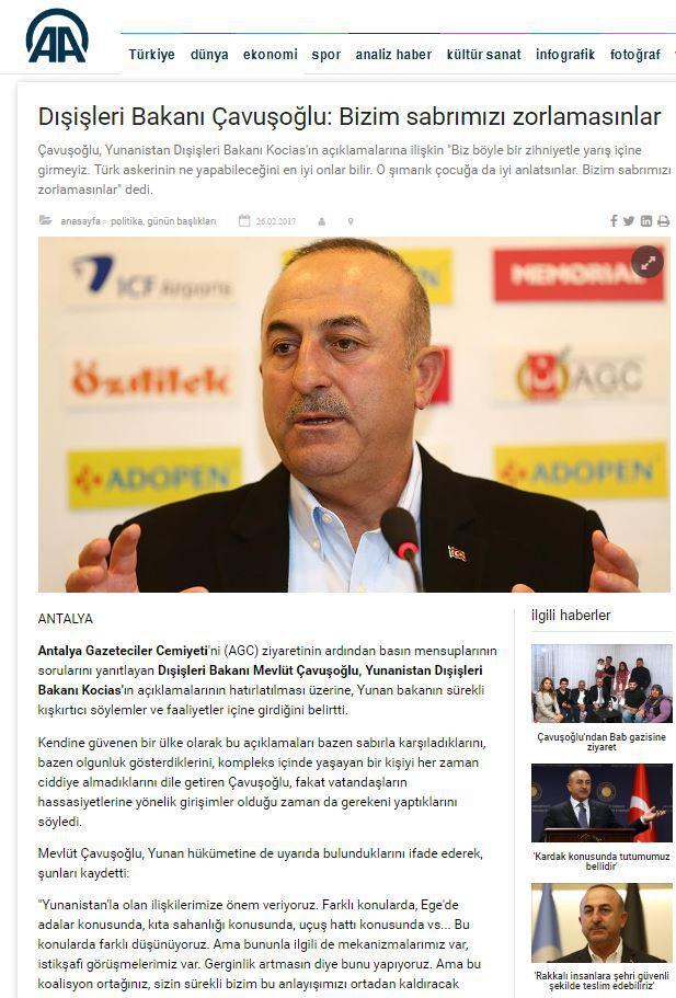 «Δίνουμε σημασία στις σχέσεις μας με την Ελλάδα. Σε διάφορα θέματα, για το θέμα νησιών στο Αιγαίο, την υφαλοκρηπίδα, το FIR κτλ, σκεφτόμαστε διαφορετικά (έχουμε διαφορετικές θέσεις). Αλλά γι αυτά έχουμε μηχανισμούς, διερευνητικές επαφές. Αυτό το κάνουμε για να μην κλιμακώνεται η ένταση. Αλλά αυτός ο εταίρος της κυβέρνησης συνασπισμού , (Πάνος Καμμένος), κάνει συνεχώς βήματα που δοκιμάζουν την κατανόησή μας. Προκαλεί. Μας λένε “ Κατά βάθος είναι καλό παιδί, μην δίνετε σημασία (ας το παραβλέψουμε)”. Ναι αλλά μέχρι πού θα πάει; Τον πήρατε αναγκαστικά στην κυβέρνηση (συνασπισμού), κι εμείς να παραβλέπουμε; Κι η υπομoνή μου έχει όρια. Δεν είναι ανεξάντλητη. Δείχνουμε ωριμότητα αλλά…Γι αυτό επειδή κάποια πολιτικά πράγματα είναι μεταξύ μας δεν θέλω να τα πώ. Βασικά γνωρίζουμε ότι και η νυν κυβέρνηση είναι ενοχλημένη από αυτό το κακομαθημένο παιδί που είναι υπουργός…
