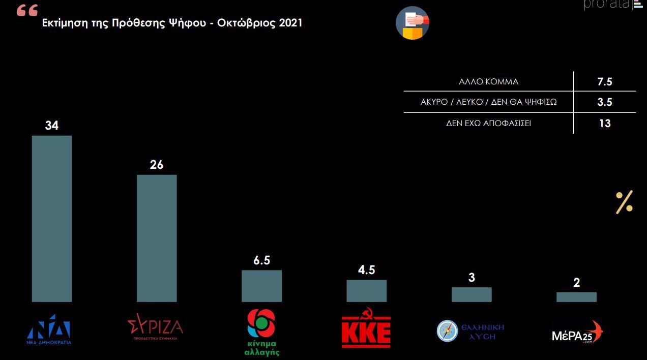 Η διαφορά ανάμεσα στο κυβερνών κόμμα και στην αξιωματική αντιπολίτευση καταγράφεται στις 8 ποσοστιαίες μονάδες. Ακολουθεί το ΚΙΝΑΛ με 6,5%, το ΚΚΕ με 4,5%, η Ελληνική Λύση με 3%, ενώ εκτός Βουλής φαίνεται να μένει το ΜέΡΑ25 με 2%.