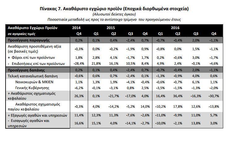 Με βάση τα διαθέσιμα εποχικά διορθωμένα στοιχεία, το Ακαθάριστο Εγχώριο Προϊόν (ΑΕΠ) σε όρους όγκου, κατά το 4ο τρίμηνο 2016, παρουσίασε μείωση κατά 1,2%, σε σχέση με το 3ο τρίμηνο 2016, έναντι της μείωσης 0,4% που είχε ανακοινωθεί στην πρώτη εκτίμηση του 4ου τριμήνου στις 14/02/17. Σε σύγκριση με το 4ο τρίμηνο 2015 παρουσίασε μείωση κατά 1,1% έναντι της αύξησης 0,3% που είχε ανακοινωθεί στην πρώτη εκτίμηση του 4ου τριμήνου.
