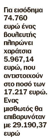 Ουσιαστικά, για καθαρό εισόδημα ύψους 74.760 ευρώ ένας βουλευτής πληρώνει φόρο εισοδήματος και ειδική εισφορά αλληλεγγύης που αντιστοιχεί στο ποσό των 17.217 ευρώ! Με βάση τις ισχύουσες σήμερα κλίμακες υπολογισμού του φόρου εισοδήματος και της ειδικής εισφοράς αλληλεγγύης, το συνολικό ποσό των φόρων που πληρώνει ένας βουλευτής χωρίς προστατευόμενα τέκνα για εισόδημα 74.760 ευρώ από κοινοβουλευτική δραστηριότητα είναι μόλις 5.967,14 ευρώ, αφού επιβαρύνεται μόνο για τις 17.217 ευρώ, ενώ για τα υπόλοιπα 57.543 ευρώ απαλλάσσεται από το φόρο εισοδήματος.