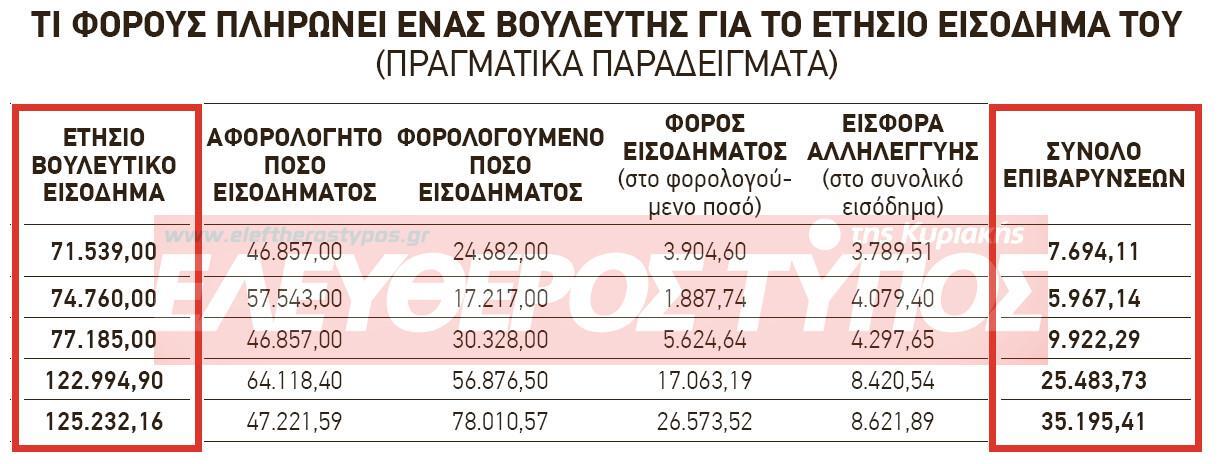 Παρόμοια παραδείγματα, από τα οποία προκύπτει ότι η ετήσια φορολογική επιβάρυνση ενός απλού πολίτη είναι 1,5 έως και 3,6 φορές μεγαλύτερη από του βουλευτή για ίδιο ποσό ετήσιου εισοδήματος παρατίθενται σε αναλυτικό πίνακα που δημοσιεύουμε παραπλεύρως.