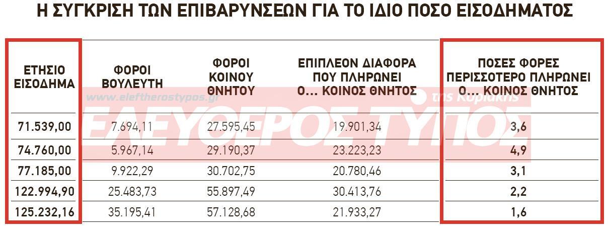 Είναι χαρακτηριστικό ότι για το ίδιο ετήσιο εισόδημα ένας απλός πολίτης πληρώνει έως και 4,9 φορές υψηλότερο φόρο από ένα βουλευτή. Πληρώνει δηλαδή για ίδιο ποσό εισοδήματος έως και πενταπλάσιο ποσό φόρου σε σύγκριση με το βουλευτή!