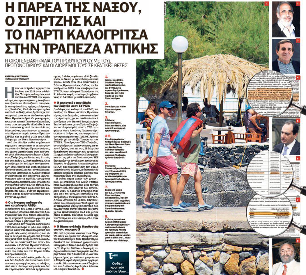 1. Ιούλιος του 2014. O Αλέξης Τσίπρας απολαμβάνει τη νίκη του Συρίζα στις ευρωεκλογές, κάνοντας διακοπές στη Νάξο, παρέα με τον Νίκο Πρωτονοτάριο.