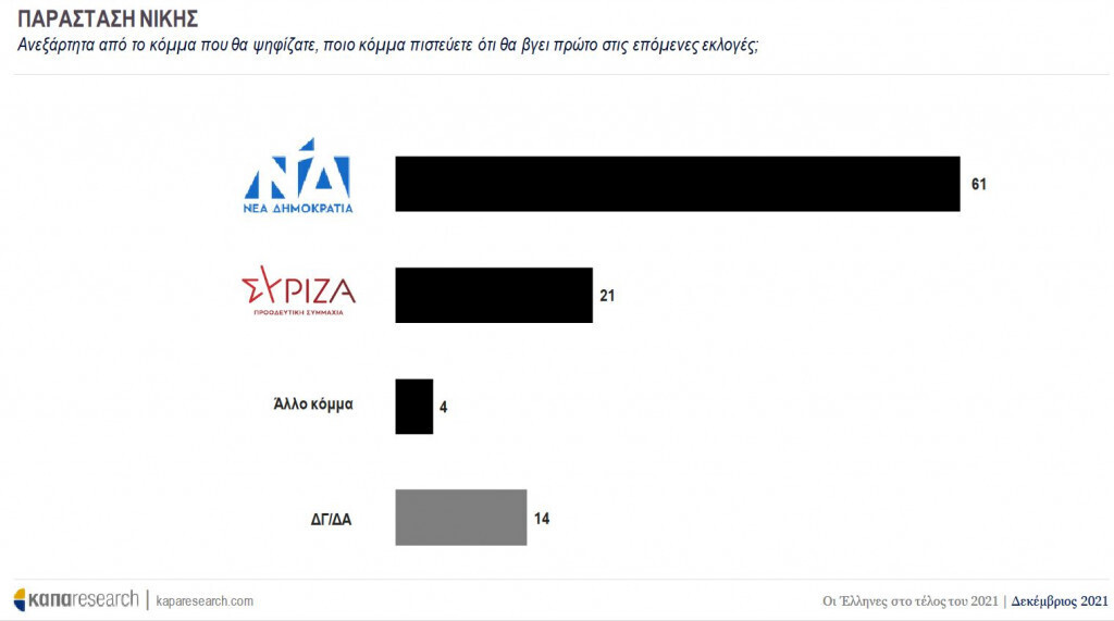 Παράλληλα συντριπτική είναι η παράσταση νίκης υπέρ ΝΔ καθώς το 61% πιστεύει ότι θα βγει πρώτο στις επόμενες εκλογές, έναντι 21% ΣΥΡΙΖΑ και 4% άλλο κόμμα.