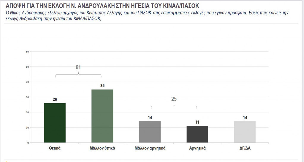 Τέλος όσον αφορά την εκλογή του Νίκου Ανδρουλάκη στην ηγεσία του ΚΙΝΑΛ το 26% απαντά «θετικά», το 35% «μάλλον θετικά», το 14% «μάλλον αρνητικά», το 11% «αρνητικά». Σύμφωνα με τη δημοσκόπηση το 75% από τη ΝΔ απαντά πως κρίνει θετική ή μάλλον θετική” την εκλογή, από το ΣΥΡΙΖΑ το ποσοστό αυτό είναι στο 43% , στο ΚΙΝΑΛ 77%, στο ΚΚΕ 53%, στη Ελληνική Λύση 67% και 53% στο Μερα25.