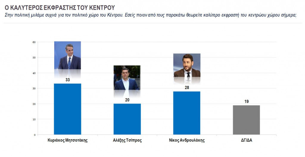 Το 68% από την δεξαμενή των ψηφοφόρων της ΝΔ απαντά ως προς τον «καλύτερο εκφραστή του κεντρώου χώρου σήμερα», ότι αυτός είναι ο Κυριάκος Μητσοτάκης. Ο Αλέξης Τσίπρας υποχωρεί στο 3% και ο Νίκος Ανδρουλάκης στο 17%.