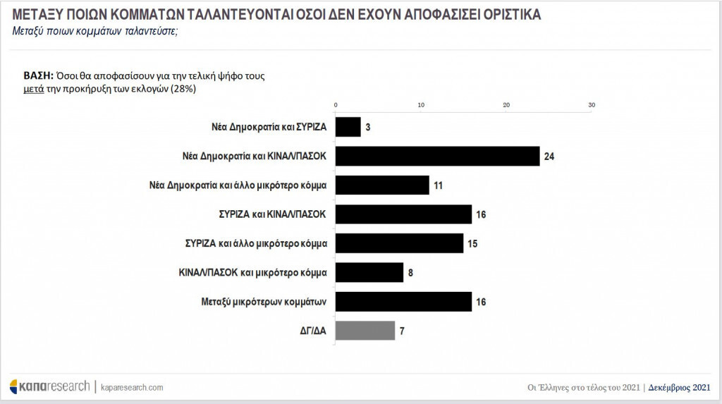 Την ίδια ώρα το 28% των ψηφοφόρων που δηλώνουν αναποφάσιστοι, θα αποφασίσει για το τι θα ψηφίσει στην κάλπη μετά την προκήρυξη των εκλογών. Από αυτούς το 24% βρίσκεται ανάμεσα σε Νέα Δημοκρατία και ΚΙΝΑΛ και το 16% μεταξύ ΣΥΡΙΖΑ και ΚΙΝΑΛ. Μόλις το 3% απαντά μεταξύ «Νέα Δημοκρατία και ΣΥΡΙΖΑ».