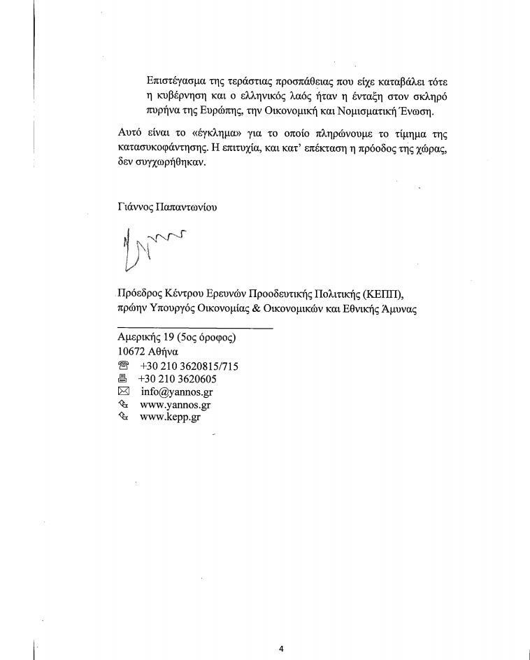Ο πρώην υπουργός, σύμφωνα με το protothema.gr επιδίδεται, μεταξύ άλλων, σε έναν απολογισμό των «επιτυχιών» της κυβέρνησης Σημίτη με κυρίαρχο της είσοδο της χώρας στο ευρώ για να υποστηρίξει «Αυτό είναι το έγκλημα για το οποίο πληρώνουμε το τίμημα της κατασυκοφάντησης. Η επιτυχία και κατ’ επέκταση η πρόοδος της χώρας δεν συγχωρέθηκαν».