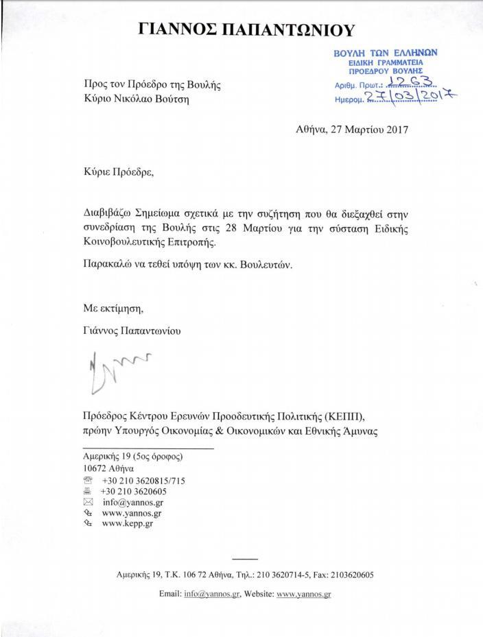 Το υπόμνημα απέστειλε στην Βουλή ενόψει της αυριανής συζήτησης στην Ολομέλεια του κοινοβουλίου της πρότασης των ΚΟ ΣΥΡΙΖΑ και ΑΝΕΛ για σύσταση προανακριτικής επιτροπής που θα ερευνήσει τα εξοπλιστικά που υπέγραψε ο πρώην υπουργός Εθνικής Άμυνας.