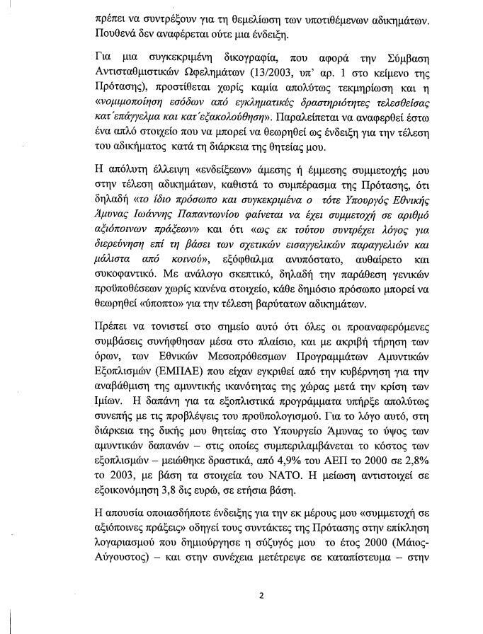 Ο κ. Παπαντωνίου υποστηρίζει ότι το σύνολο των συμβάσεων του υπουργείου Εθνικής Αμυνας έχει υποστεί «εξονυχιστικό» έλεγχο επι 14 χρόνια και «δεν προέκυψε κανένα απολύτως στοιχείο».