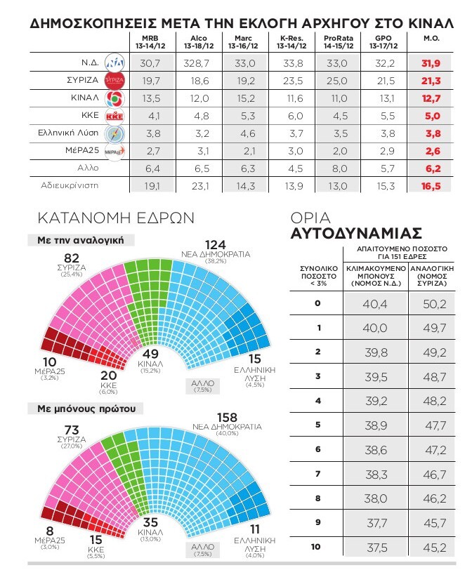 Κατά συνέπεια, περίπτωση αυτοδυναμίας στις πρώτες εκλογές, δεν υπάρχει, καθώς η Ν.Δ. με ποσοστό 38,2% που προκύπτει από την αναγωγή των τωρινών δημοσκοπήσεων χωρίς την αδιευκρίνιστη ψήφο θα διαθέτει 124 έδρες. Ενδεχομένως το μόνο ρεαλιστικό κυβερνητικό σχήμα που θα μπορούσε να προκύψει θα ήταν η συνεργασία Ν.Δ. και ΚΙΝΑΛ που θα απέδιδε 173 κοινοβουλευτικές έδρες.