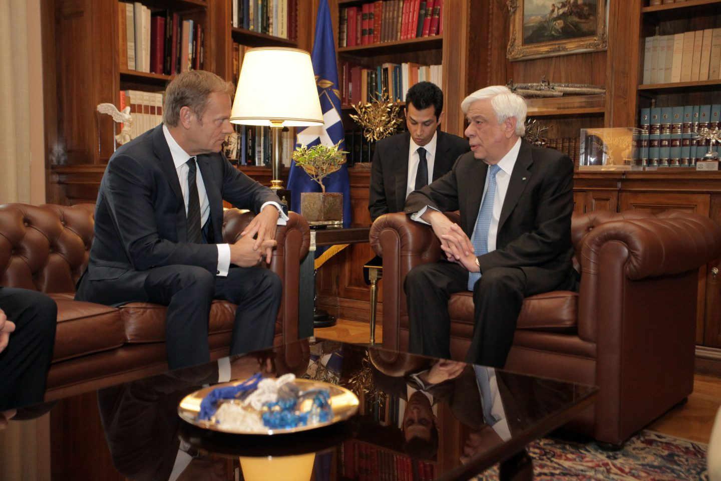 Με ιδιαίτερη χαρά σας υποδέχομαι στην Προεδρία της Δημοκρατίας και σας συγχαίρω εκ νέου για την επανεκλογή σας ως Προέδρου του Ευρωπαϊκού Συμβουλίου, ευχόμενος κάθε επιτυχία στο έργο σας. Η Ελλάδα, το γνωρίζετε καλώς, είναι αποφασισμένη να συμβάλλει, ακόμη και πέρα από το μέτρο που της αναλογεί, προς αυτή την κατεύθυνση.