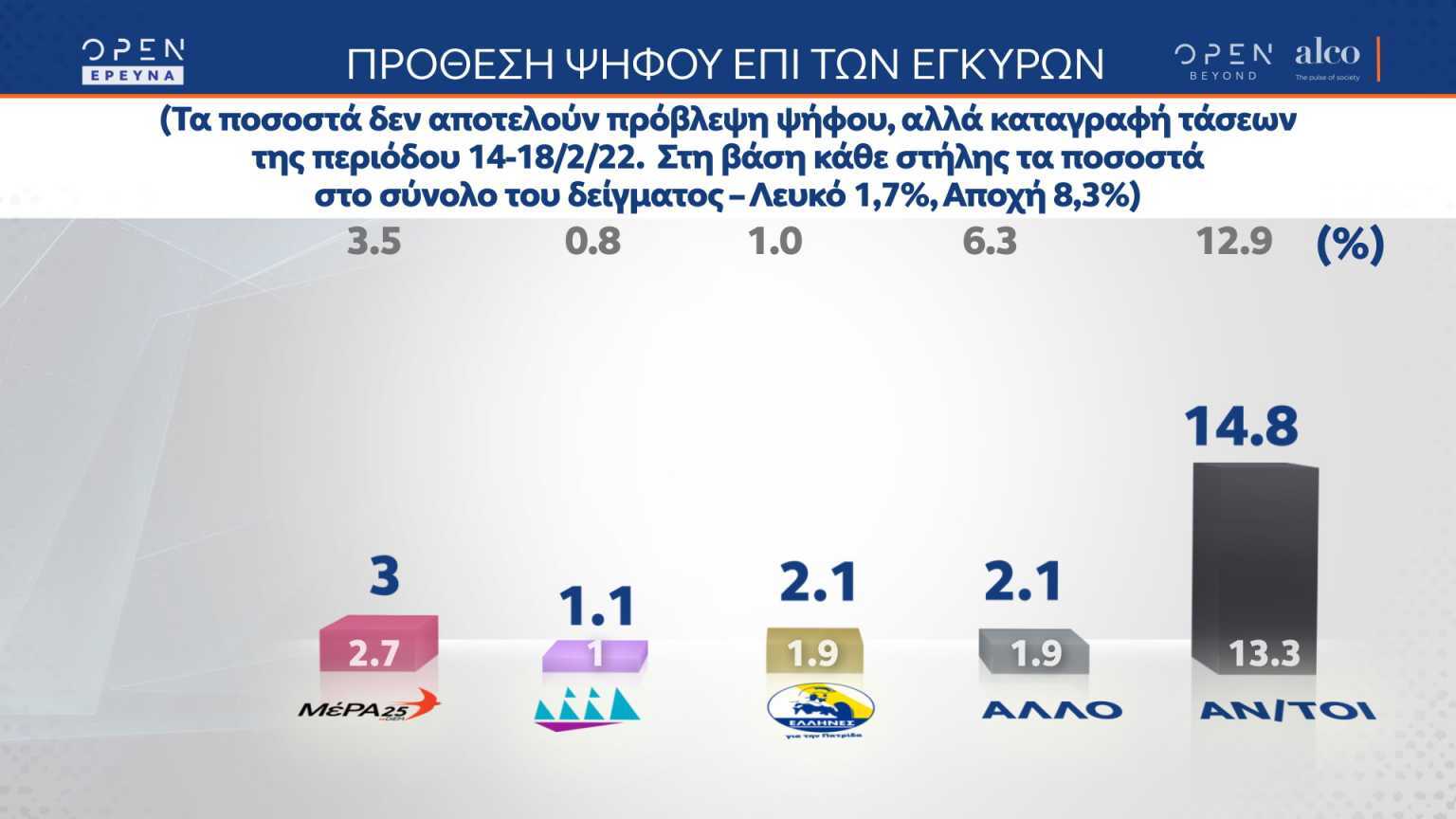 Η Νέα Δημοκρατία εμφανίζεται με ποσοστό 31,8% στην πρόθεση ψήφου επί των εγκύρων, με τον ΣΥΡΙΖΑ στο 22,2% και το Κίνημα Αλλαγής στο 14,6%, με άνοδο μισής ποσοστιαίας μονάδας.