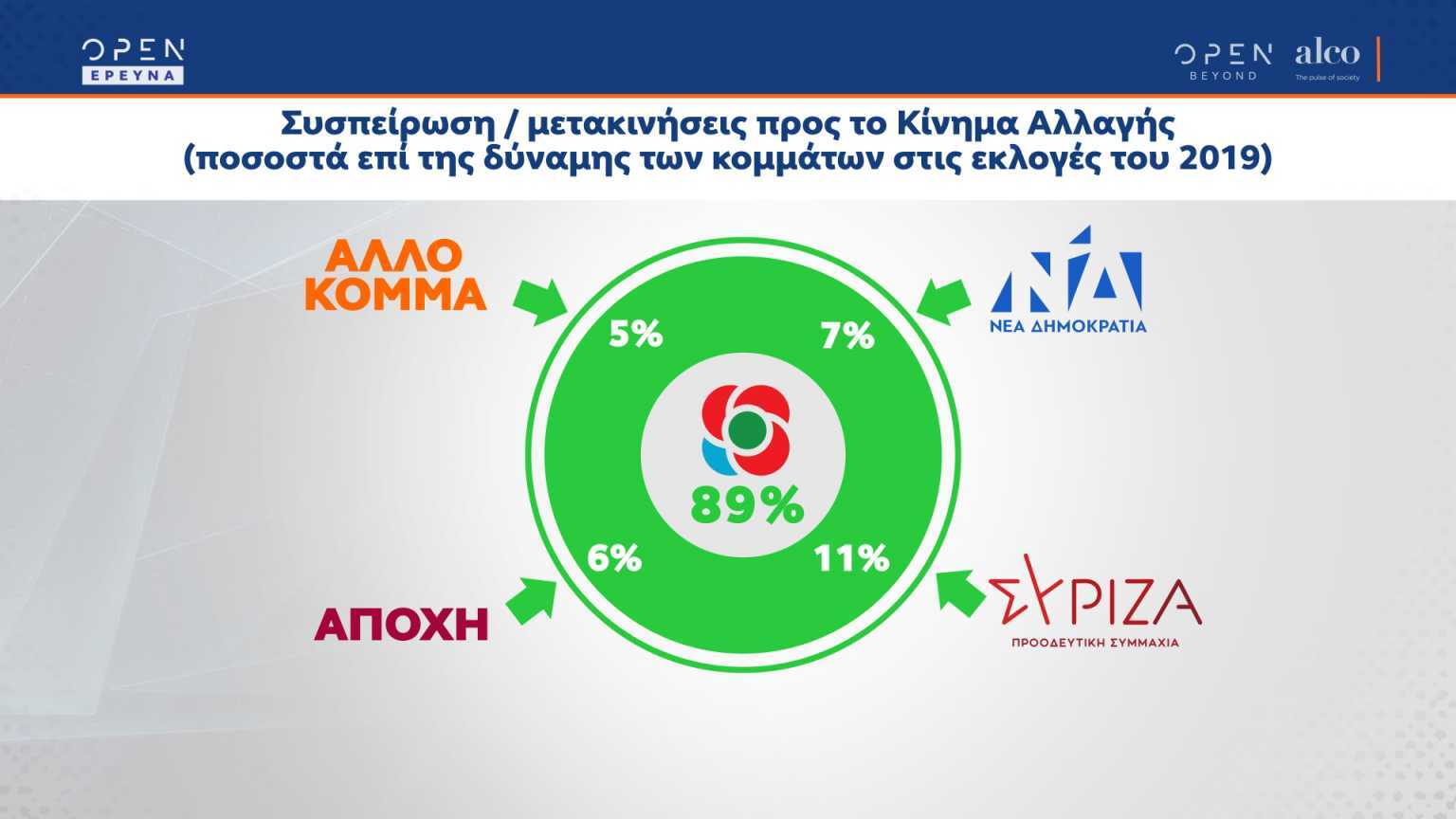 Eνδιαφέρον παρουσιάζει και το γεγονός ότι το ΚΙΝΑΛ δείχνει να αντλεί ψηφοφόρους και από τη Νέα Δημοκρατία (7%) αλλά και από τον ΣΥΡΙΖΑ (11%), ενώ 6% προέρχεται από ψηφοφόρους που επέλεξαν να μην πάνε στην κάλπη το 2019.