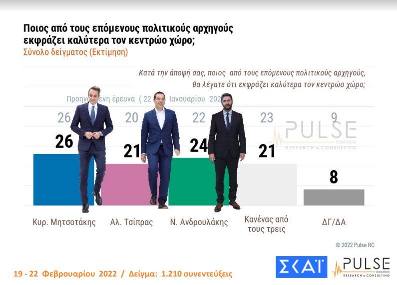 Στο ερώτημα ποιος πολιτικός αρχηγός εκφράζει καλύτερα τον κεντρώο χώρο, ο Κυριάκος Μητσοτάκης και πάλι προηγείται με 26%, ακολουθεί ο Νίκος Ανδρουλάκης με 24% και τρίτος έρχεται ο Αλέξης Τσίπρας με 21%.