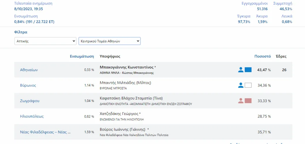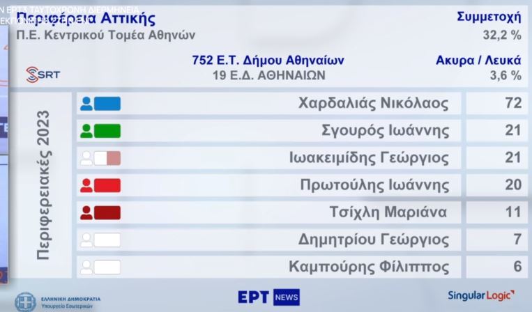 Προβάδισμα του Νίκου Χαρδαλιά δείχνουν τα πρώτα αποτελέσματα από το 72ο εκλογικό τμήμα του Δήμου αθηναίων για την Περιφέρεια Αττικής. Στην δεύτερη θέση μέχρι στιγμής βρίσκεται ο Γιάννης Πρωτούλης.